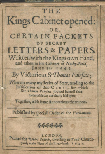 His correspondence was captured and 37 letters between Charles and the Queen were carefully chosen and edited to ‘prove’ that he was the mere vassal of a foreign, Catholic, wife. These letters were published under the title The King’s Cabinet Opened. A commentary depicted Henrietta Maria as a transgender perversion of nature. It pointed to shocking examples of her mannishness, such as when “you see she marcheth at the head of an army and calls herself the generalissima”. “This,” one parliamentary journalist wrote, “is the Dear Heart which hath cost him almost three Kingdoms”, and the true “wearer of the breeches”.