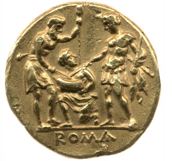 - Gold coin — oath-taking scene between two soldiers: © The Trustees of the British Museum