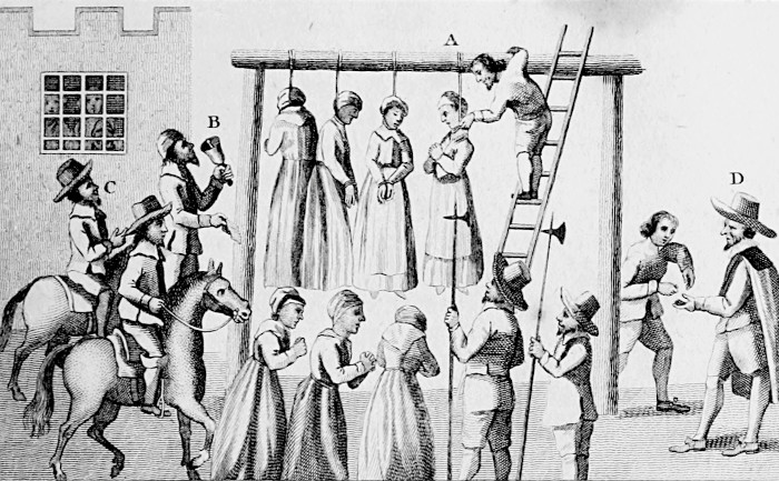 - The ‘witches’ being hanged (see 4) from England’s Grievance Discovered by Ralph Gardiner, 1655, reprinted 1796: Internet Archive (public domain)