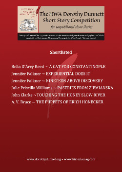 Betty Moxon of the Dorothy Dunnett Society added: ‘For the second year running the partnership between the Dorothy Dunnett Society and the Historical Writers Association has resulted in a great competition that has uncovered some amazing writers. Dorothy Dunnett, who famously started writing because she had run out of good historical novels to read, would have been delighted by the winning stories, and the skill and talent of the authors.’